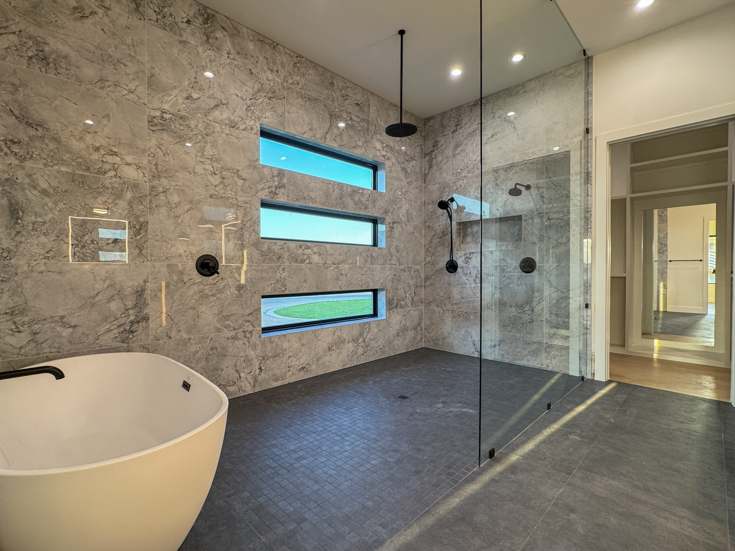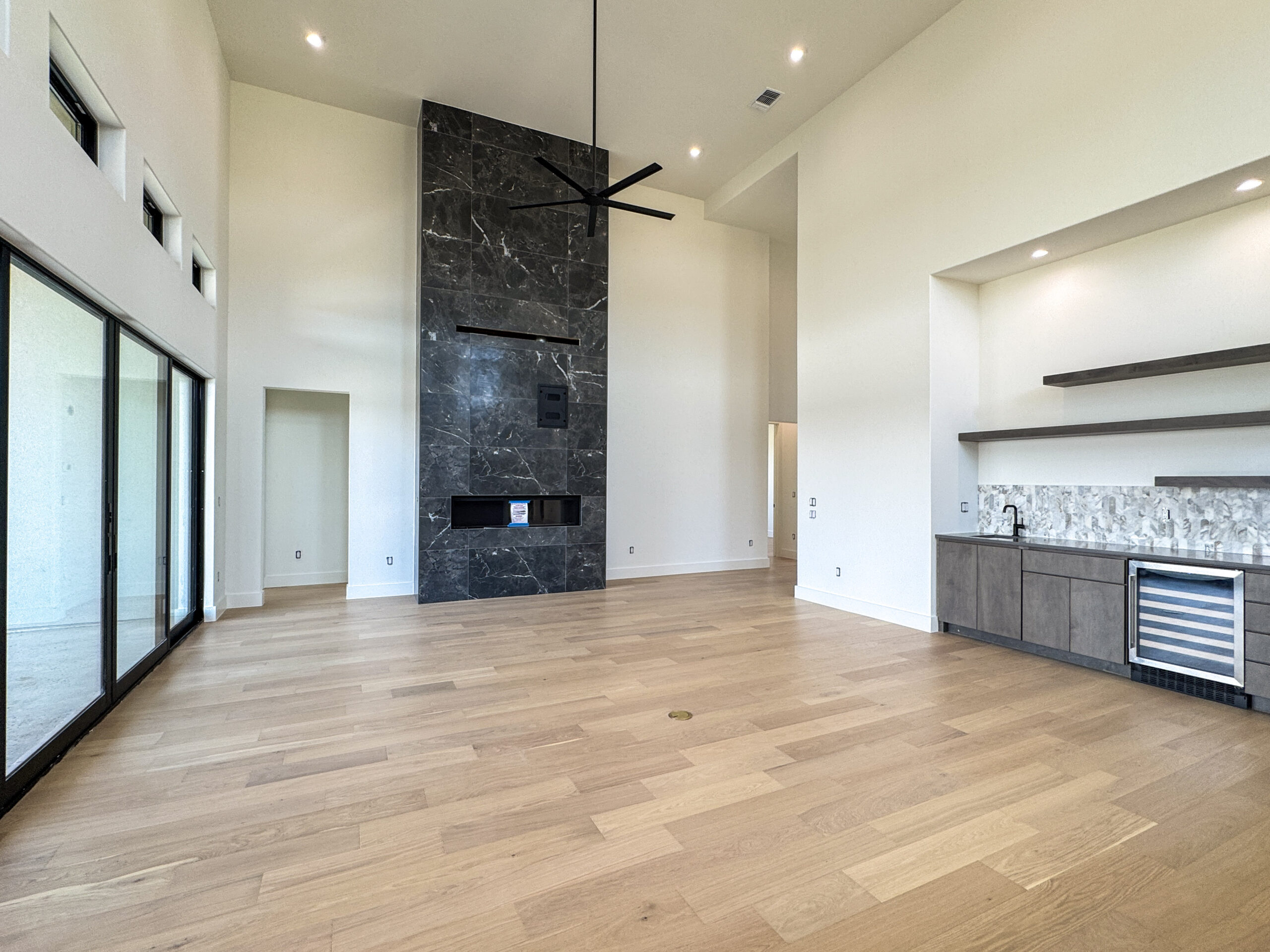 This open-concept home features a chef’s kitchen with a wet bar, hardwood floors, a floor-to-ceiling fireplace, and a spa-inspired primary suite. Each bedroom includes a private bath, plus golf cart storage and no rear neighbors for added privacy. Enjoy peaceful views from the back porch through a 12-foot sliding glass door.